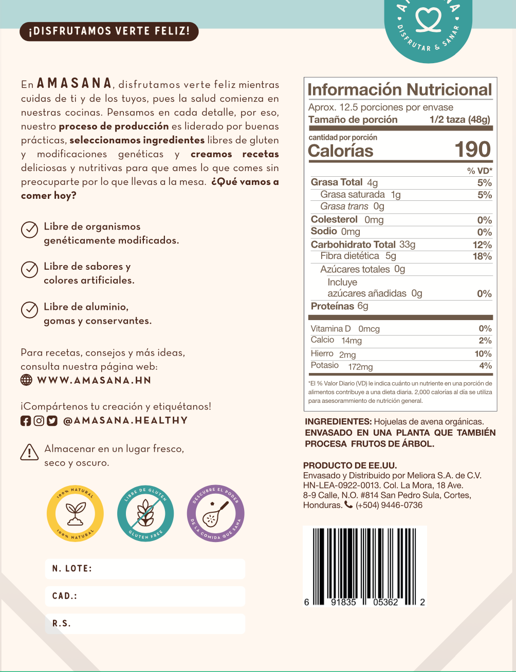 Nuestras hojuelas de avena son orgánicas, de estilo tradicional, grano entero y libres de gluten. Nos aseguramos de ofrecer hojuelas de avena orgánicas, ya que sabemos que la avena que no es orgánica es uno de los cereales más contaminadas de glifosato (un químico cancerígeno).