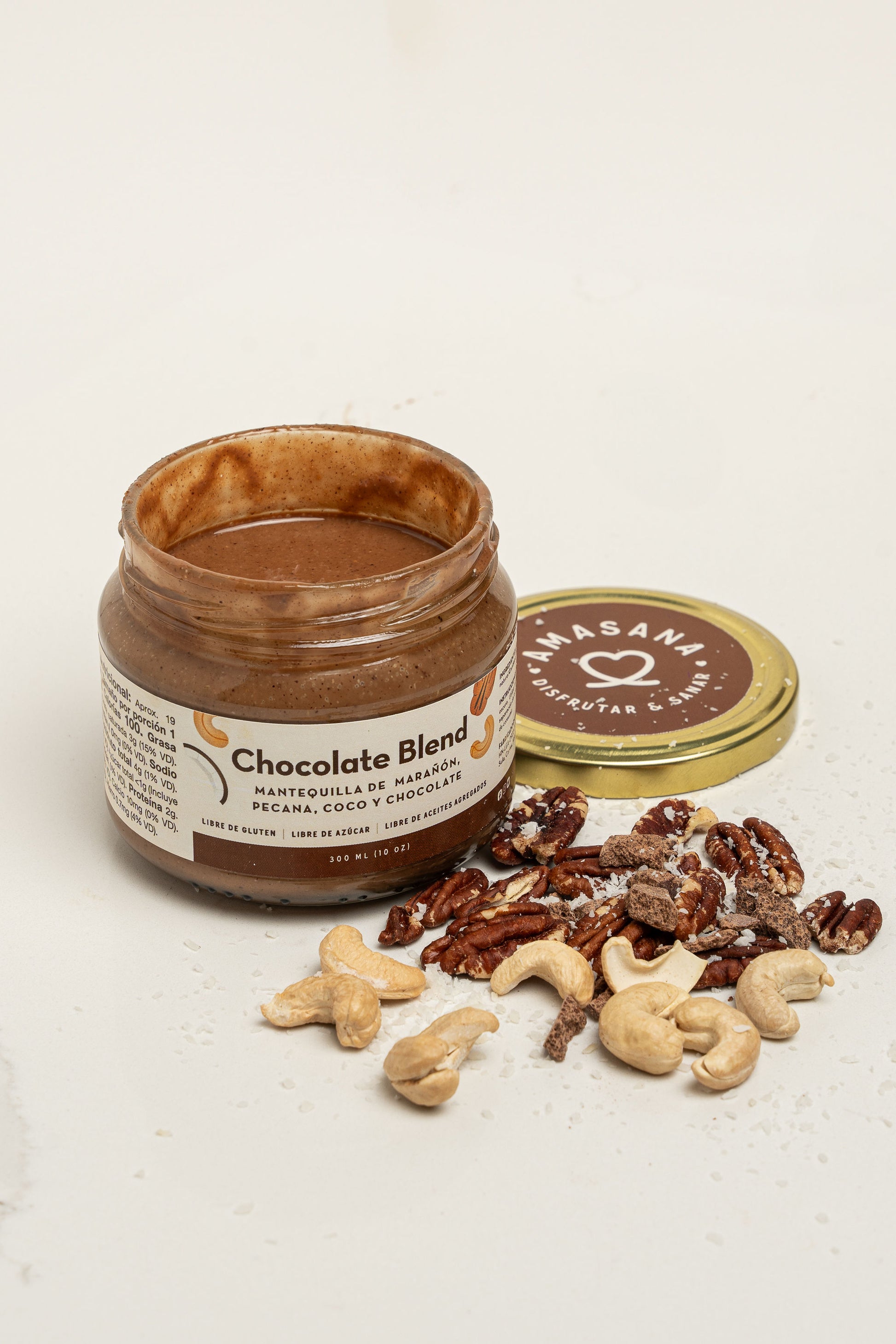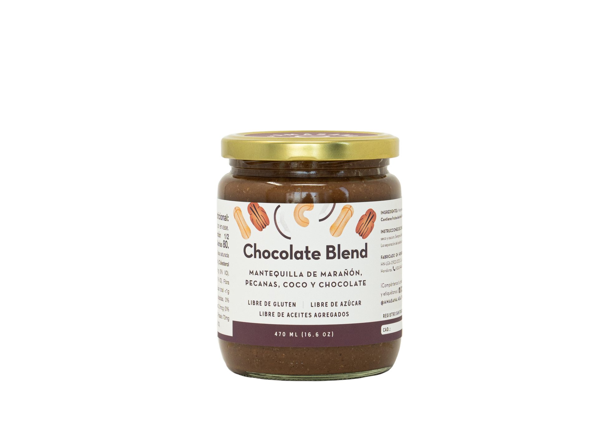 Nuestra Mantequilla Chocolate blend esta hecha de marañones, pecanas y coco tostados lentamente en el horno, y le agregamos chocolate 100% puro para crear una mantequilla de chocolate sedosa y de sabor balanceado.